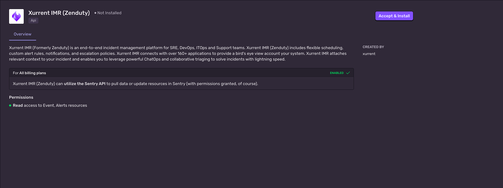 - Search for Xurrent IMR (Zenduty) and click on it. Now, click on the Accept & Install button.