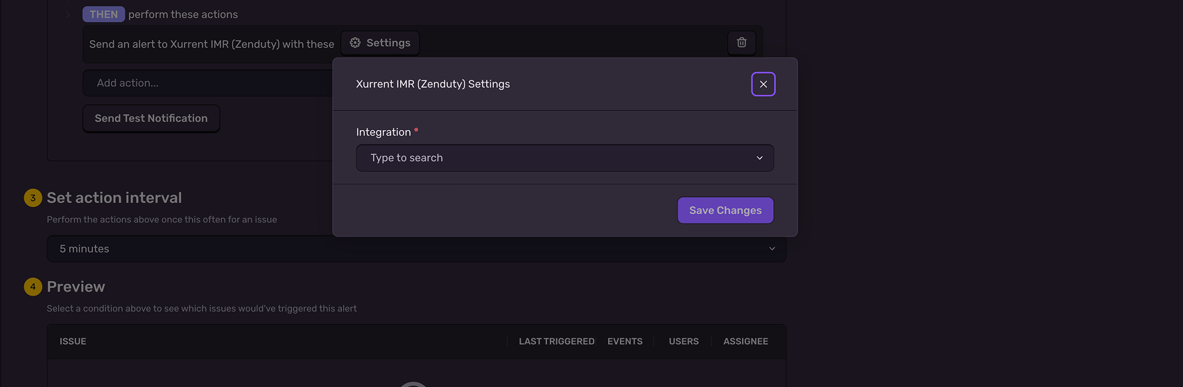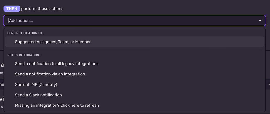 In the THEN section, Add Action -> integrations -> Xurrent IMR (Zenduty).